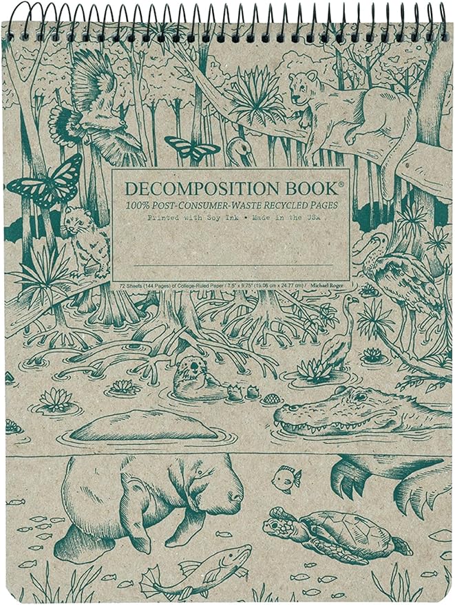 - Eco-Friendly & Thoughtfully Made: Crafted with 100% post-consumer waste recycled paper and printed with soy ink, this Decomposition Book is perfect for environmentally conscious consumers. The top-bound design eliminates side wire interference, making it ideal for left-handed writers, creatives, and students alike. Proudly made in the USA using sustainable practices.