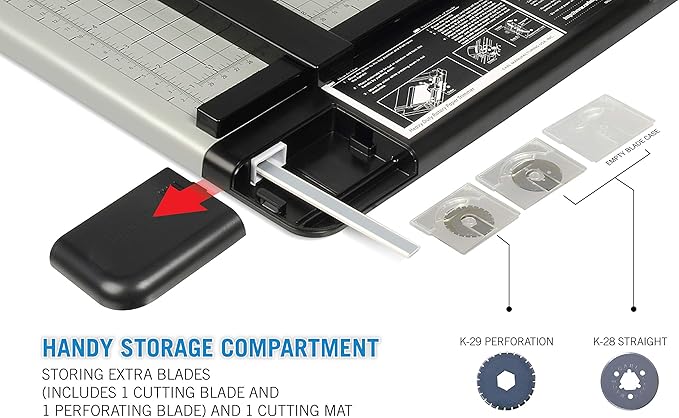- Blade length: 15", premium steel. Extra cutting mat, straight blade, and perforating blade included.