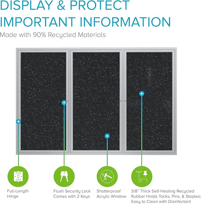 Ghent 36"x72" 3-Door indoor Enclosed Recycled Rubber Bulletin Board, Shatter Resistant, with Lock, Satin Aluminum Frame, Confetti (PA33672TR-CF) ,Made in the USA