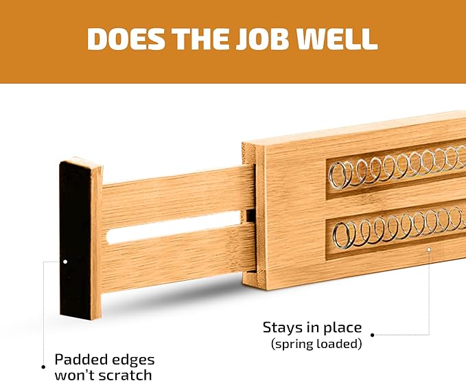 - HIGH QUALITY: The bamboo drawer dividers are sturdy, with strong springs that keep them firmly in place; The eva foam at the edge of the bamboo drawer organizers protects your drawer’s surface