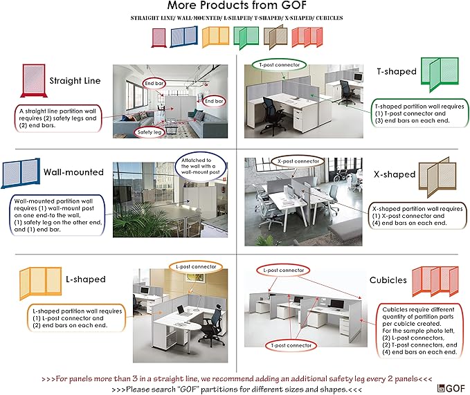 - Includes ONE SET of <36"D x 96"W x 48"H> L-Shaped Freestanding Partition, consisting of One 36"w x 48"h Panel, Two 48"w x 48"h Panels, 2 End Bars & 1 L-Post