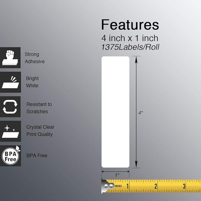 - [ Specifications ]: 4 in x 1 in (102 mm x 25 mm) (1375 Labels/Roll, 2 Rolls),Paper tube diameter:1"(25.4mm). No Ink Toner or Ribbons Needed! Save your money and effort.