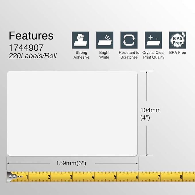 - [ Specification ]: 4 in x 6 in (104mm x 159mm) Extra Large Shipping Labels - Replacement for DYMO LW 1744907 S0904980 1755120 1951462 - Paper Tube Diameter:1"(25.4mm) - 12 Rolls & 2640 Labels (220 Labels/Roll)