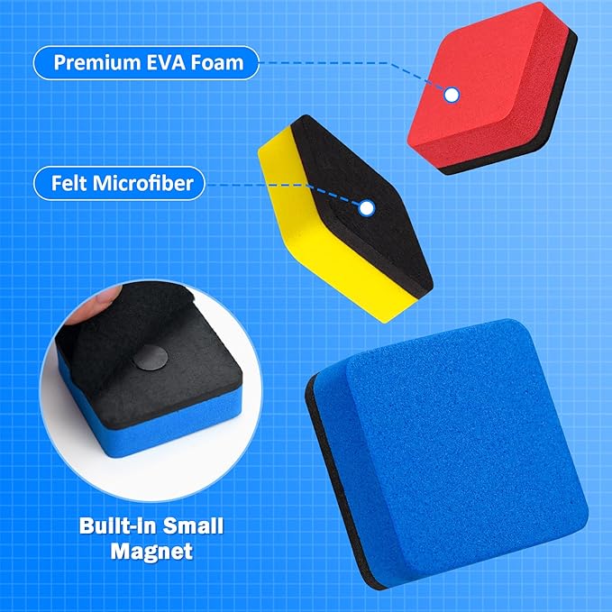 - DURABLE AND WASHABLE: Our dry erasers are made of premium quality EVA foam and high-density felt bottom, non-toxic, and easy to clean the erase markers on glass or white board. And the felt side of the eraser is magnetic and can be absorbed to the whiteboard. The erasers are hand-washable with water and soap for reuse