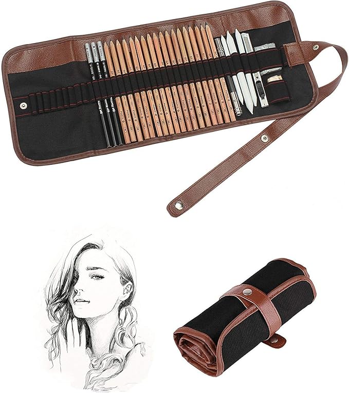 - 【Choose completely】A set with a wide range of different hardness of Sketch Pencil (18pcs sketch pencils ranging from 2H to 8B), 3 Charcoal Pencils (Soft, Medium, Hard), 3 color paper blending stumps, 1 Art Knife,2 Erasers(Kneadable Eraser, 4B Art Eraser)and 1 Pencil Extender, all well-organized in a washable leather-trimmed canvas roll up pencil bag .This sketch pencil set(Total 29 Pack) contains just about everything you need to begin sketching.It is what growing artists need.