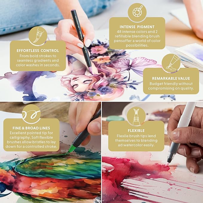- Vivid Pigments – Blends smoothly over other true and deep colors, and yet can be much lighter color on a wet ground. 48 true deep intense colors and 2 refillable real brush pens packaged in premium gift box.