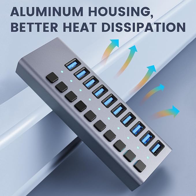 48W Powered USB Hub - ACASIS 10 Ports USB 3.0 Data Hub, Individual On/Off Switches, 12V/4A Power Adapter, Aluminum Housing, USB Splitter for PC, Computer, Mobile HDD, Flash Drive