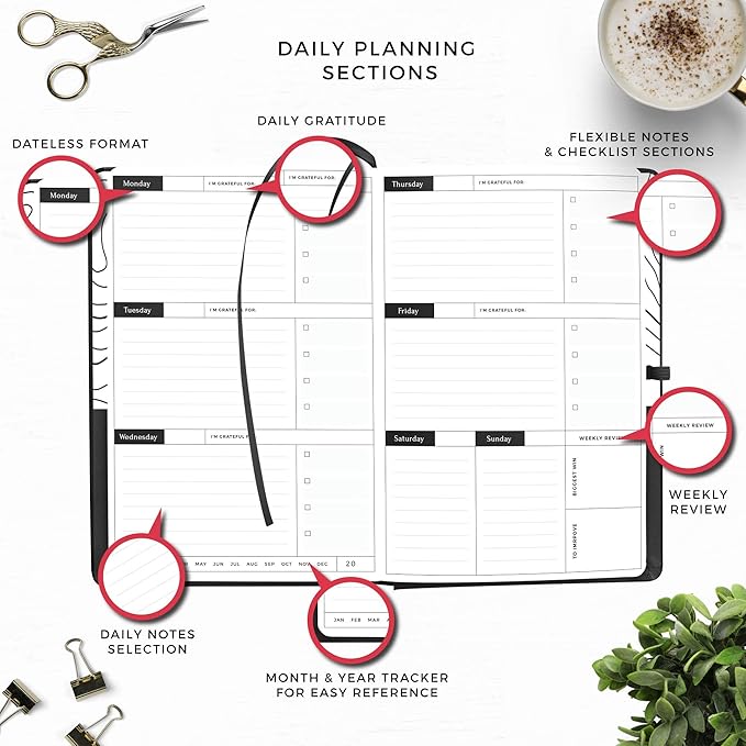 - β VEGAN FRIENDLY, ELEGANT and ATTRACTIVE DESIGN - Our undated daily and monthly school planner would make a great gift for college students. Includes 3 silk bookmarks for multi-section planning, an elastic strap closure and an expandable inner back pocket.