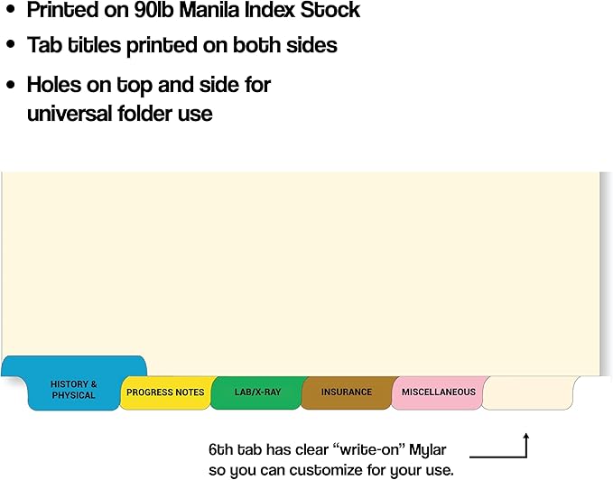 - DIVIDER SET DETAILS: Each set of file dividers is pre collated and has 6 color coded tabs. Each set consists of the following pre printed tab titles: Position 1 - HISTORY & PHYSICAL (Blue Colored Tab), Position 2 - PROGRESS NOTES (Yellow), Position 3 - LAB/X-RAY (Green), Position 4 - INSURANCE (Brown), Position 5 - MISCELLANEOUS (Pink), Position 6 - BLANK WRITE-ON. Contains 260 complete sets of 6 index tabs.