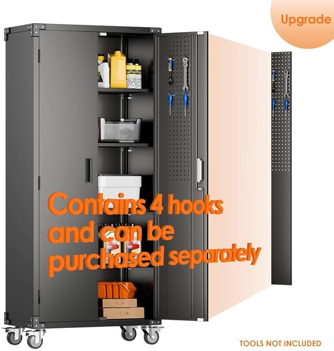 - [Garage&Home Storage Cabinet] Plenty of storage. "great garage cleanup".You can move them around as needed and the casters and wheels work great on all the different surfaces in your garage. Extra storage strong and fit your needs, it is sufficient for garage use. If your house literally has NO closets on the 1st, floor. you needed this metal storage cabinet for your board games, cases of water,as well as miscellaneous items. Rolls easily which is great when moving to a new home.