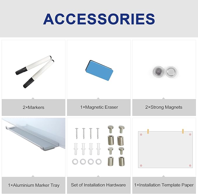 - Setting up your new glass whiteboard is a breeze with our straightforward installation process. Mounting hardware is included, allowing you to quickly and securely affix the board to any wall.