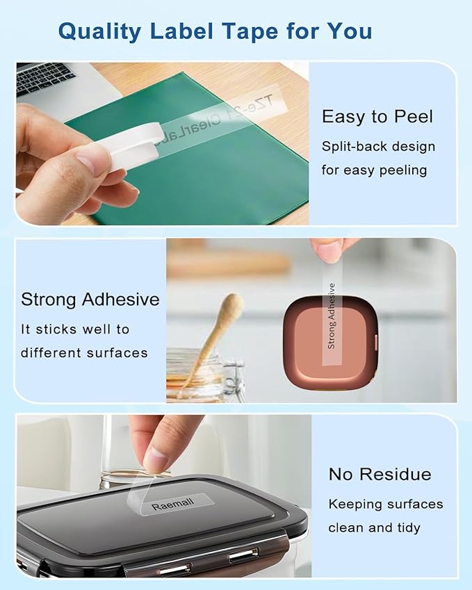 - Easy to Apply: P touch clear label tape split backing makes the clear labels easy to peel and apply; TZe-131 Label maker tape black on clear won't leave residue behind when peeled off most surfaces. Won't smudge or smear