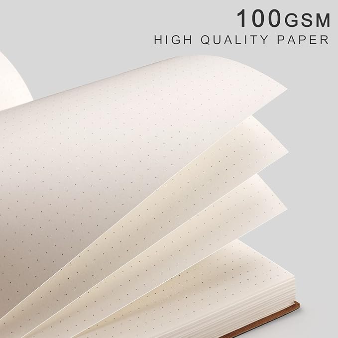 - PU Leather Softcover: Premium PU leather soft cover protects the dotted journal from wear and tear, sturdy thread-bound binding combined with softcover makes the notebook 180°lay flat, thus giving you a comfortable writing experience