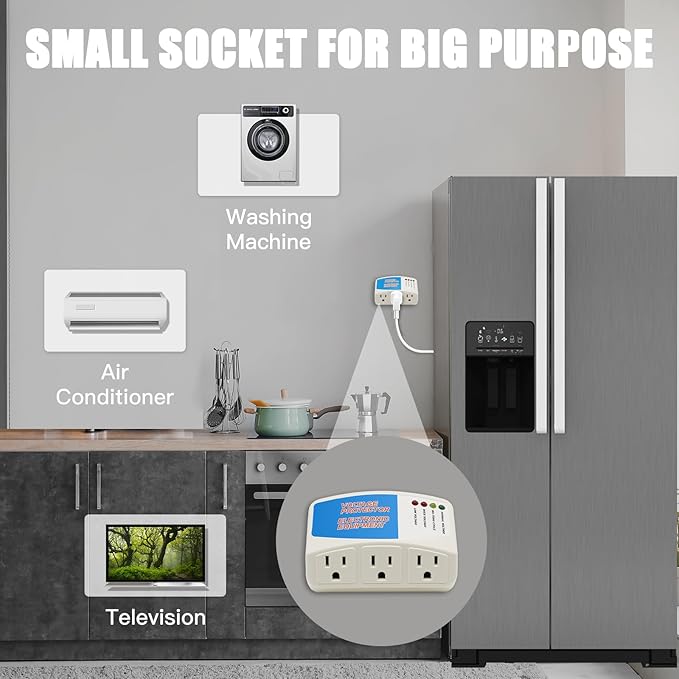 - Applicable Devices: The power surge protector outlet suits for air conditioners, freezers, ice makers, washing machines, ovens, microwave ovens, dishwashers, coffee machines, bread machines, water heaters, and electric fans, etc