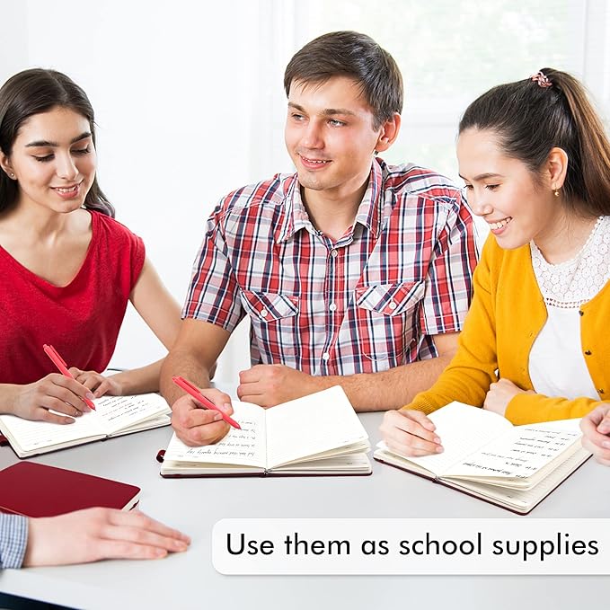 - Feela 5 Pack Classic Ruled Notebooks contains 5 classic wine ruled sturdy cover notebooks and 5 Black Retractable Pens. Each of the notebooks measures 8.3” x 5.1”, which is perfect to carry and easily held by young girls and boys. These black cute pens are customized to be placed in the pen holder, which is pretty convenient.