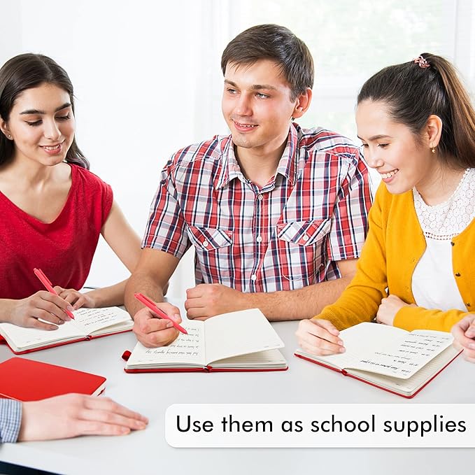 - Feela 3 Pack Classic Ruled Notebooks contains 3 classic red ruled sturdy cover notebooks and 3 Black Retractable Pens. Each of the notebooks measures 8.3” x 5.1”, which is perfect to carry and easily held by young girls and boys. These black cute pens are customized to be placed in the pen holder, which is pretty convenient.