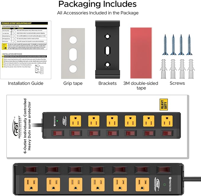 - [Individual Switches & Wide Spaced] This heavy duty power strip is equipped with 6 individual switches and one master switch, offering you the freedom to control each device separately, which is both energy-saving and cost-effective. The outlets feature a generous 1.77-inch wide spacing, designed to accommodate plugs of all sizes, preventing blockage issues. You can effortlessly use multiple bulky adaptor plugs at the same time without the need to frequently plug or unplug, greatly enhancing convenience and operational efficiency.