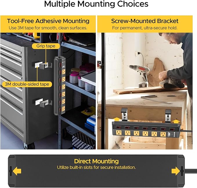- [Versatile Mounting Options] 1. Direct Mounting: Utilize the built-in mounting slots on the back of the strip itself to securely install it directly onto any suitable surface. 2. Tool-Free Adhesive Mounting (Bracket Included): Attach the included mounting bracket effortlessly to smooth, clean surfaces using the provided strong 3M adhesive tape. Simply snap the power strip securely into the bracket. 3. Screw-Mounted Bracket: For a permanent, ultra-secure hold, fasten the included mounting bracket to walls or other surfaces using screws.
