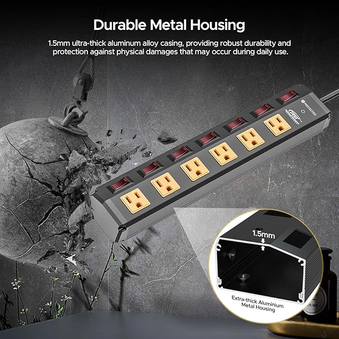 - [Ultral Heavy Duty] The metal power strip with 1.5mm extra-thick aluminum alloy housing and reinforced engineering plastic covers make it extremely strong and durable. Perfect for garage, workshop, kitchen, office, home, school.