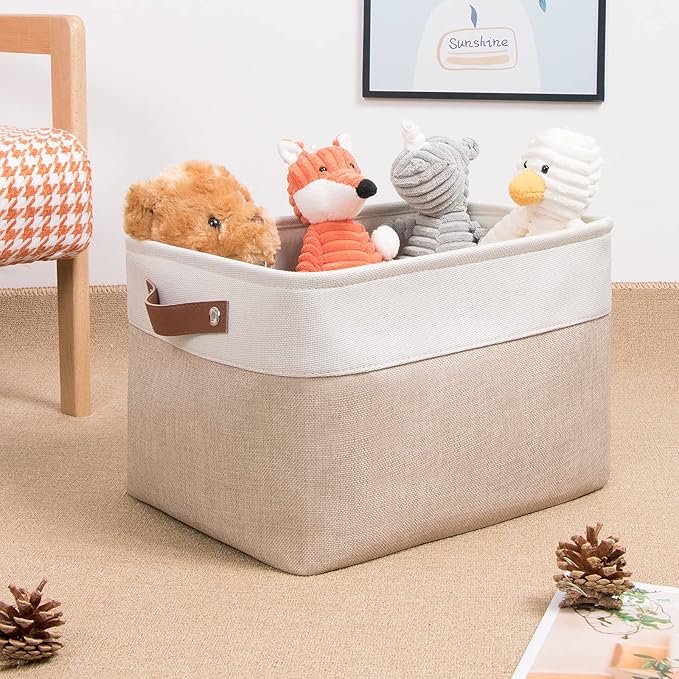 DULLEMELO Fabric Storage Bins, Storage Baskets for Organizing, Collapsible Rectangular Fabric Baskets for Shelves, Empty Gift Baskets (3-Pack Medium-15 inch X 11 inch X 9.5 inch , White&Khaki)
