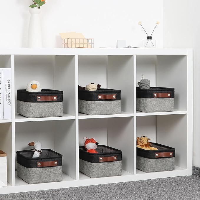 DULLEMELO Small Storage Baskets for Shelves, Small Fabric Collapsible Rectangular Storage Bins for Shelves, Closets, Nursery, Home, Office, Empty Gift Baskets (6-Pack, Black&Gray)