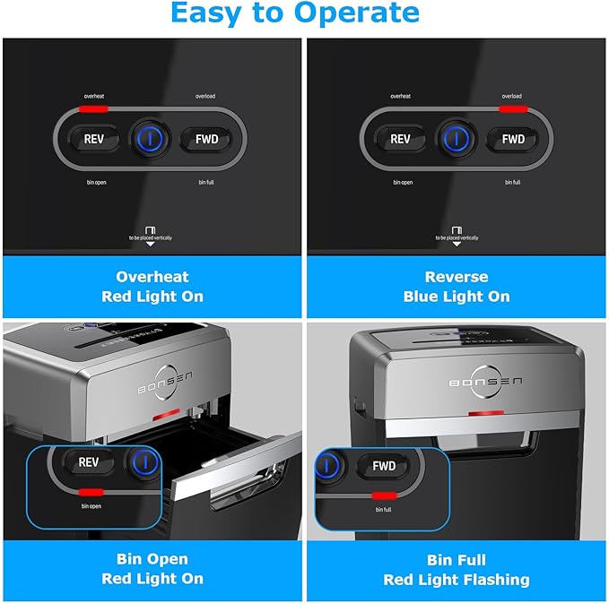 - Easy to Use & Jam Proof: 3 button control (Power On, Forward, Reverse) and LED light indicators (Power On, Overheat, Overload, Bin Open, Bin Full); Overheating (Red Light On) and Overloading (Red Light Flashing) protection systems make it safer to use