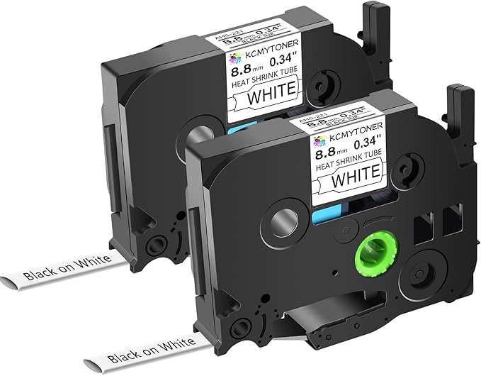 - Package Included: 2 pack KCMYTONER compatible for ptouch HSe-221 HS-221 HSe221 HS221 heat shrink tube label tapes; color: black text on white tape; size: 3/8 inch (8.8mm, flattened width) x 4.92 feet (1.5m).The size indication for this heat-shrink tube label is the width of the flattened tube as a label in a label printer. Do be aware that the size given relates to the label making machine, not the wire. HSe-221 8.8mm tube suits cables ranging from Φ2.6mm to Φ5.1mm in diameter.