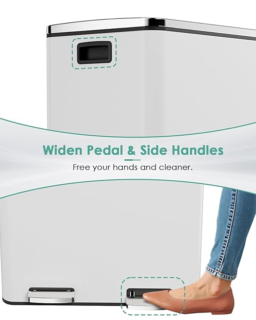 - THICK & WIDE PEDEL: Wide and thick stainless steel pedal is ergonomically designed, so you can throw out trash without bending over, and you don't need to touch the lid of the bucket when throwing out trash.