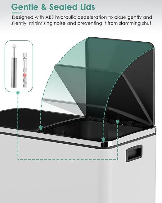 - DUAL TRASH CAN: Trash can has double compartments, which makes it easier for you to separate dry and wet trash. Each compartment has an independent lid to make the trash no smell pollution exists.