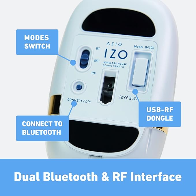 Azio IZO Wireless Optical Mouse - Bluetooth 3.0 & 5.0/2.4G RF-USB, Ambidextrous Design, PixArt PAW3212 Sensor, 1000/1600/2400 DPI, Rechargeable, PC & Mac
