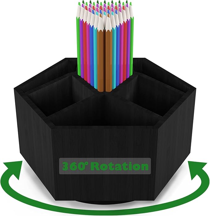 - 【MULTIFUNCTIONAL PURPOSE】The spinning organizer is designed to keep your stuff well organized, 7 sections, 1 big triangle section in middle will be perfect for your pens, crayons, scissors, paint brushes, scissors, staplers stationery, cutlery and more. The elegant design of our desktop storage organizer makes it perfect to use for classroom, living room, office supplies