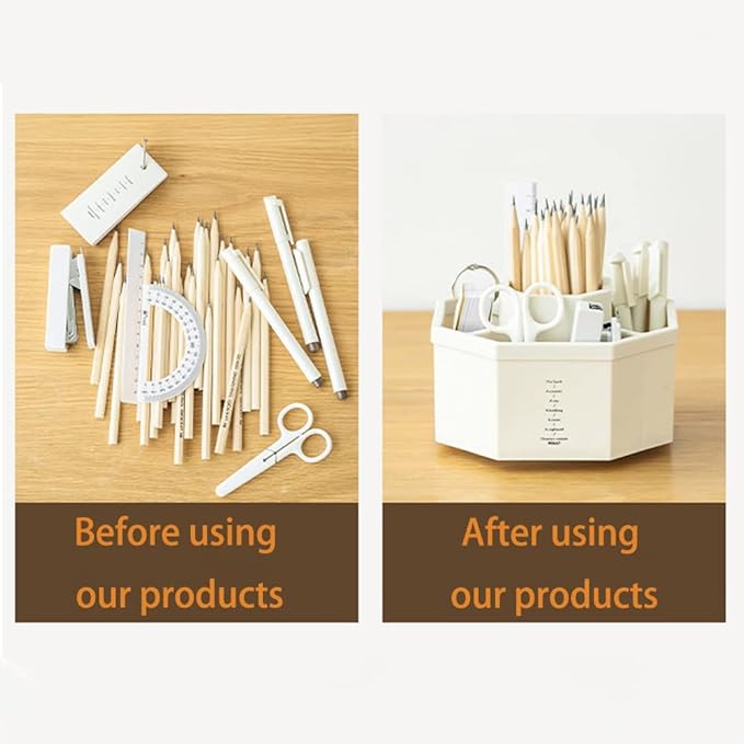 - β360 Degree Revolving Design: Simply spin this pencil holder to store or take out your things, this storage organizer allows you to keep all of your things within reach. Our office plastic desk organizer with divided 5 compartments that will organize pens, pencils, , ruler, clips, scissors and other office accessories separately