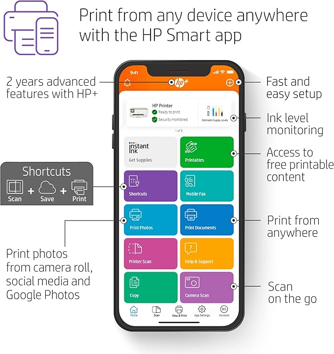 - INCLUDES HP+ SMART FEATURES – Activate HP+ to get advanced features for mobile printing, security, automatic updates and more. HP+ only works with an HP account, internet connection and HP Ink for the life of the printer