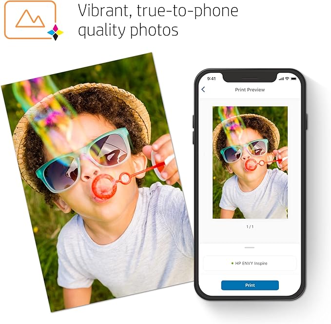 - VIBRANT PHOTOS – Photos that look as vibrant as they do on your screen with true-to-phone quality prints, plus custom photo features in the HP Smart app. HP 5x5" square and 4x12" panoramic photo paper sizes are optimized for the HP ENVY Inspire series