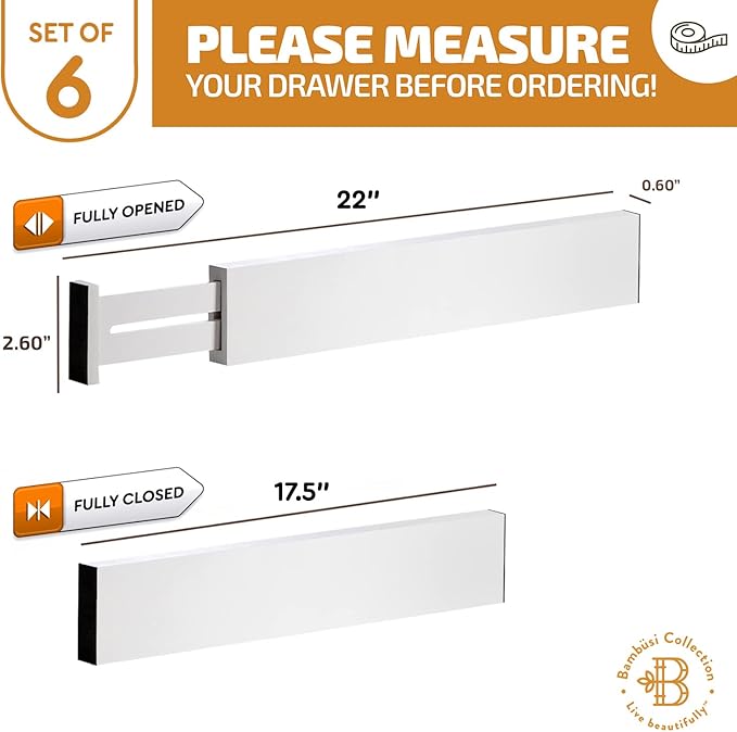 Adjustable Bamboo Drawer Divider Organizers - 6 Pack Large Expandable Drawer Organization Separators for Kitchen Utensils, Dresser, Bedroom, Bathroom, Baby Drawer, Office - 17.5” to 22" (White)