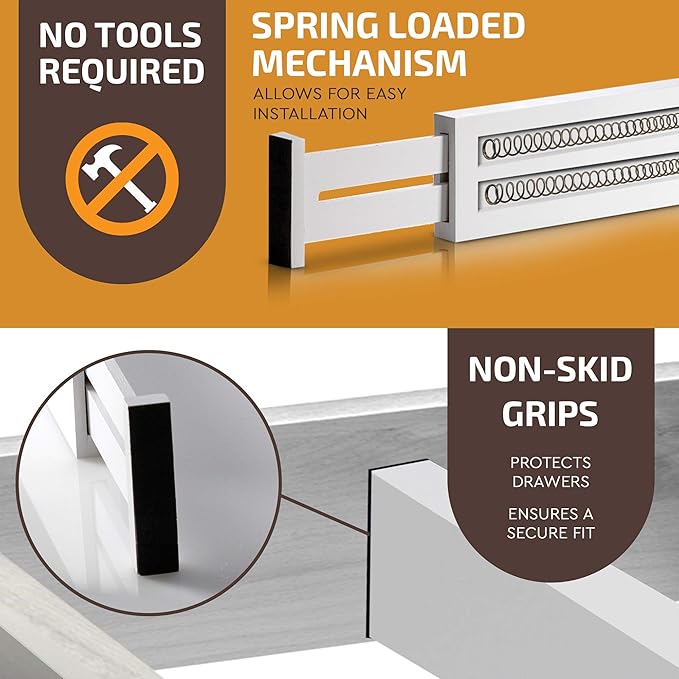 - QUICK & EASY INSTALLATION - The wood kitchen drawer dividers are spring-loaded with excellent tension + padded at the ends with eva foam, keeping the bamboo drawer dividers tightly in place. Installation is a simple swipe, without scratching your furniture.