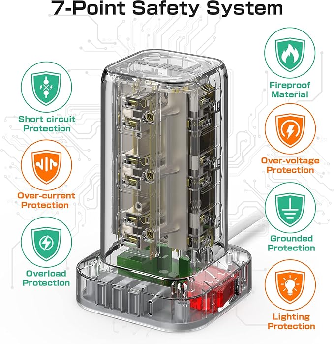- 【Safe and Ease of use 】The 6.5FT upgraded extension cord with multiple outlets is made of pure copper. Reinforced design at the junction of the stand of power strip tower and the wire head. To protect the terminal from wear and tear. Environmental protection and fire-resistance PC shell with flame retardant at 1382℉ makes it more safe and longer lifetime.