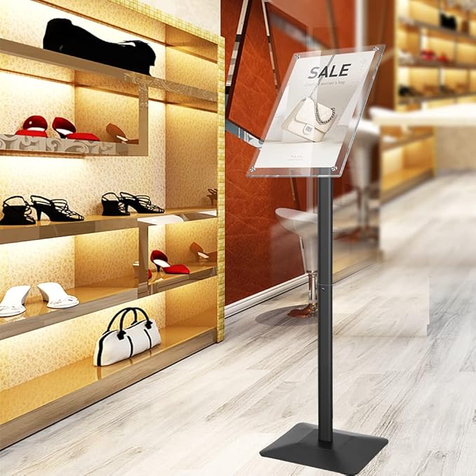 - Multi-angle Display floor stand - Sturdy metal material floor standing acrylic sign holder,the rotating head feature allows the advertisement to be used in portrait or landscape as you like.Our new stylish Floor Sign Holder captures the customer's attention in all frequented traffic areas.