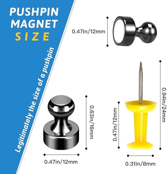 - 【Premium Material】Strong fridge magnet will never let you down! magnets are made of neodymium material, 3-layer (Nickel + Copper + Nickel) Triple-coated, with a smooth edge. These push pin magnets are tiny too, the size of each magnet is 0.47in/12mm x 0.62in/16mm, so they won't cover up the exact things you want to display. They are strong and are suitable for any magnetic surface but are not suitable for glass magnetic boards, note that stainless steel is NOT magnetic.