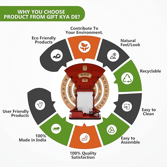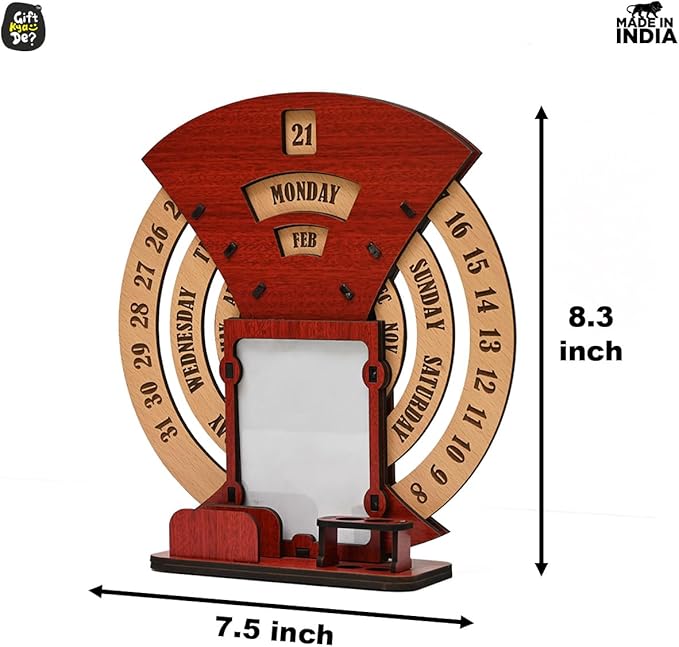 - Designer Home Decor: The beautiful designer calendar 2023 , where you can keep your photo, pen, and cardholder that serve as the perfect piece of home and office decor. Three individual circular rings dedicated to dates, days, and months are placed in an indigenous manner, which may be rotated very easily and precisely to change days, dates, and months to give you a new day every day. This calendar for desks is not limited to any particular year.
