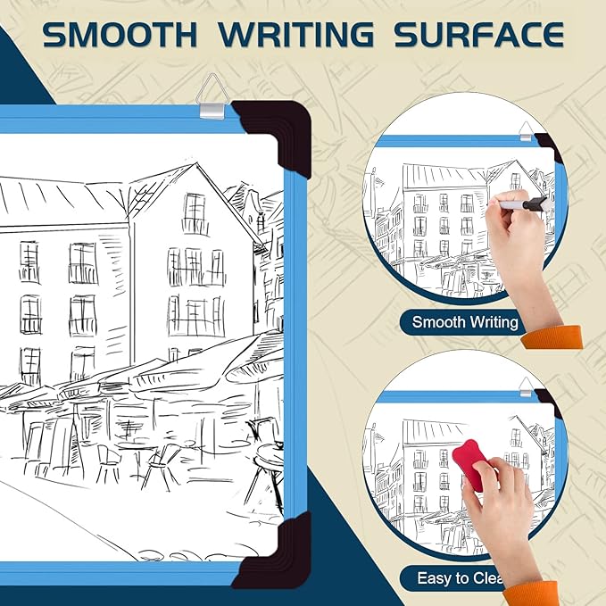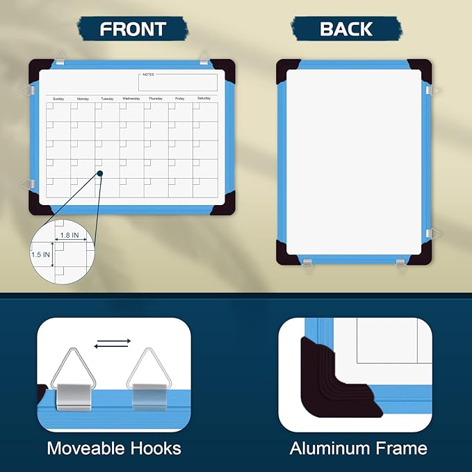 - Durable & Portable Whiteboard: Calendar white board for wall wall with aluminum frame is solidly built, not easy to scratch or break. Featured with stain resistant surface, you can erase for countless times without any smudgy ghosting or staining. The movable hanging hooks can be adjust the hanging distance, allows you to set up your dry erase calendar board either horizontally or vertically. Small portable white board is lightweight, it is suitable for handheld as well.