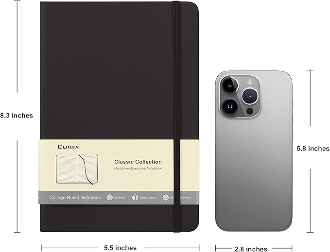 Comix 6 Pack Lined Journal Notebooks for Work, 240 Pages, 5.5"x8.3", Black, Hardcover, A5 Medium College Ruled, Journaling Notebooks for Notes-taking, Fits for Office School Home