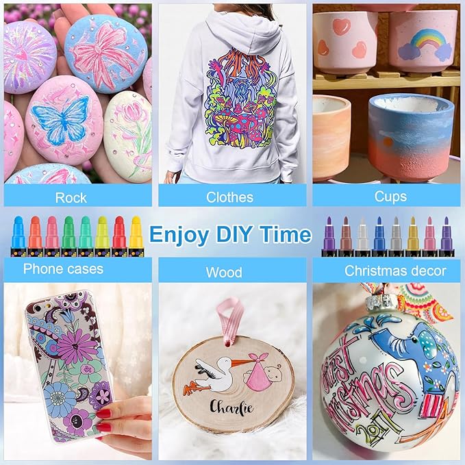 - 【Work Well on Diverse Surface】Betem acrylic markers provides smooth inking for a variety of surfaces such as paper, cardstock, metal, rock painting, wood, plastic, canvas, fabrics, ceramics, and more. High-quality opaque water-based ink with odorless and acid-free. Keep your artwork colors alive for a long time. Just express your imagination!