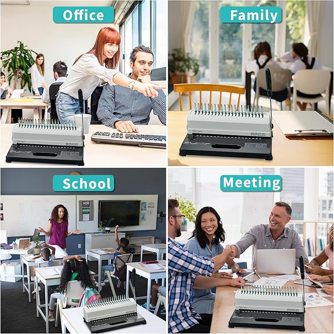 - 【Humanized Design】Our comb binding machine features advanced cutting blades and an ergonomically designed curved handle, allowing you to cut paper effortlessly with minimal force. The 19-hole punch is specifically designed for Letter-size paper but can also accommodate A5 size (15 holes) or other smaller sizes. This comb binding machine is engineered for consistency, ensuring long-term use and professional-quality bound documents.
