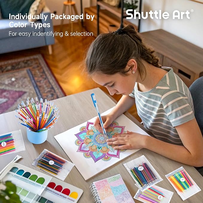 - 180 UNIQUE COLORS: Shuttle Art Gel Pen Refills Set has 180 unique colors, including 7 color types: glitter, neon glitter, metallic, neon, pastel, swirl, standard. Abundant colors with varied color types, fully meet your demands of coloring, writing and drawing.