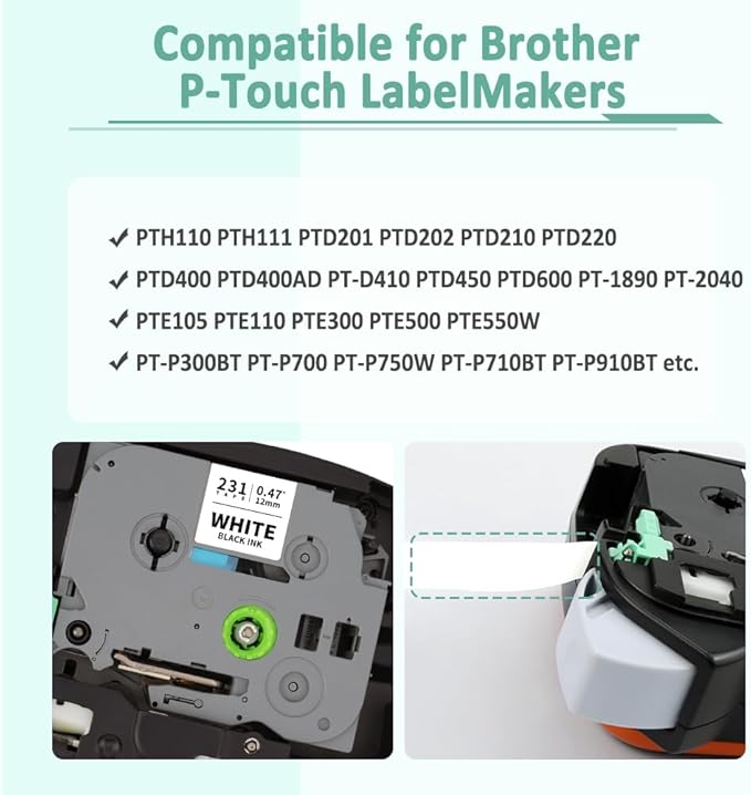 - Compatible with Brother P touch Tze 12mm Label Makers: PT-D200 PT-D201 PT-D202 PT-D210 PT-D215e PT-D220 PT-D400 PT-D400AD PT-D400VP PT-D450 PT-D600 PT-D600VP PT-D800W PT-E100 PT-E105 PT-E110 PT-E300 PT-E500 PT-E550W PT-E800W PT-H100 PT-H103W PT-H105 PT-H110 PT-H111 PT-H300 PT-H300LI PT-H500 PT-H500LI PT-P300BT PT-P700 PT-P710BT PT-P750W PT-P900 PT-P900W PT-P910BT PT-P950NW PT-200 PT-300 PT-1090 PT-1010 PT-1100 PT-1280 PT-1170 PT-1180 PT-1230PC PT-1290 PT-1880 PT-1950 PT-2040 PT-2730 PT-2430PC
