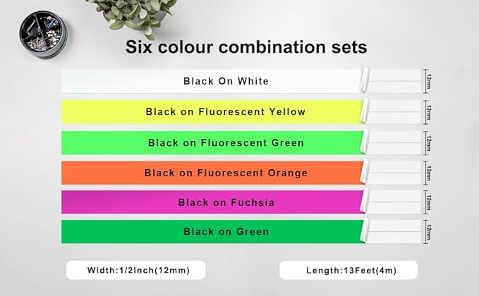 - 【Package In Cludes】 - Set of 6 colors label tape compatible with brother m label tape. Replacement for brother p touch M tape 12mm 0.47 M-K231 black on white, (M-KC31)black on Fluorescent Yellow, (M-KD31)black on Fluorescent Green, (M-KB31)black on Fluorescent Orange, (M-KP31)black on Fuchsia, (M-KBL31)black on Lake blue; Size : 1/2 inch x 26.2 feet ( 12 mm x 8 m) ;