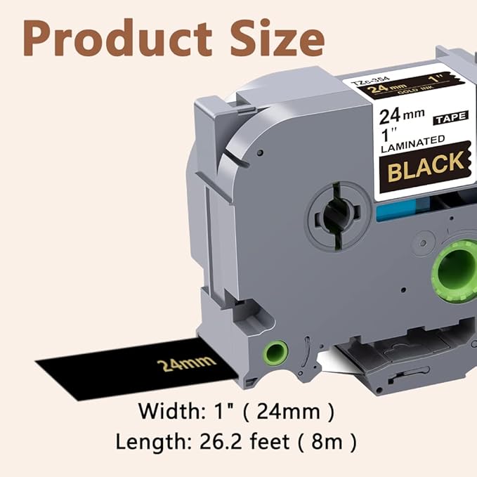 - Product features : Split back, water resistant, fading resistant, abrasion resistant, temperature resistant, strong adhesive. This compatibel label tape 24mm TZe-354 Gold ink on black is suitable for indoor and outdoor use