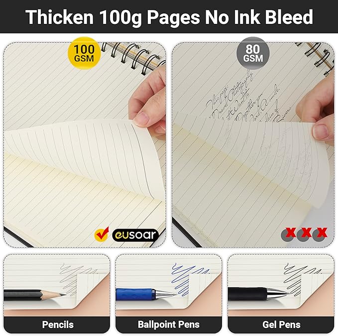 - 【Package Included】6 packs A5(5.5"x8.3") lined notebooks(each book has 240 pages/120 sheets of paper). And 100gsm thickened inner paper is great for smooth writing with no ink bleed. Also the beige color could greatly protect our eyesight.
