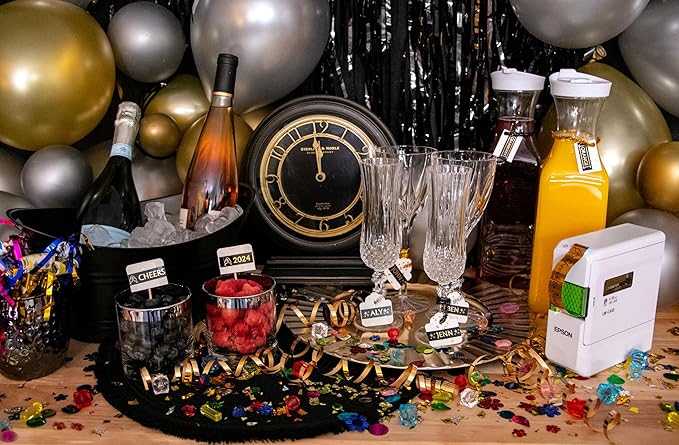 - DIMENSIONS AND COLOR - This Epson Labelworks Designer Collection tape is 3/4" (18mm) in width and 30 ft in length. The label maker tape is Black and prints with Gold text. Works with Epson LABELWORKS PX printers and K-Sun printers, more listed below and in product description.